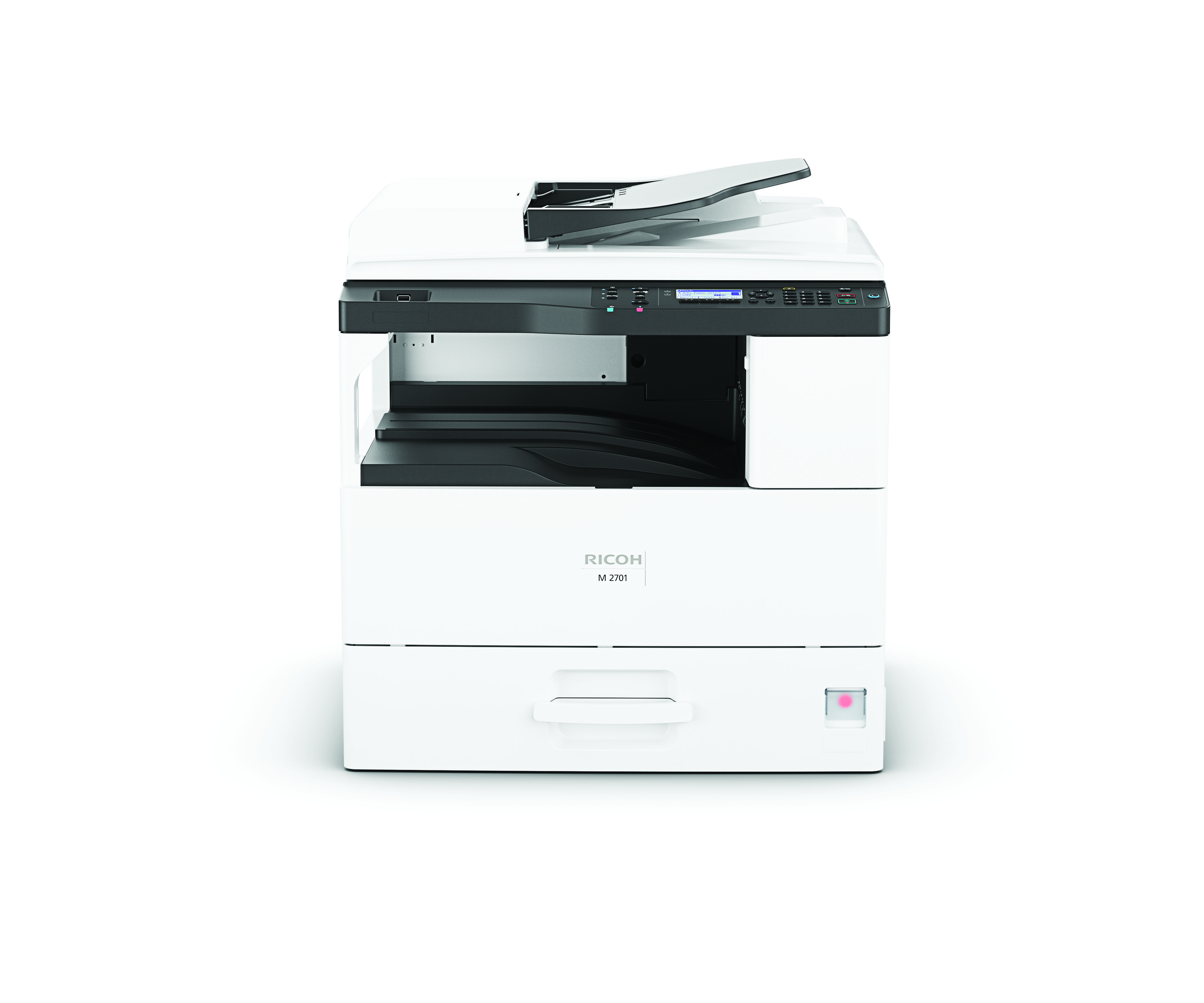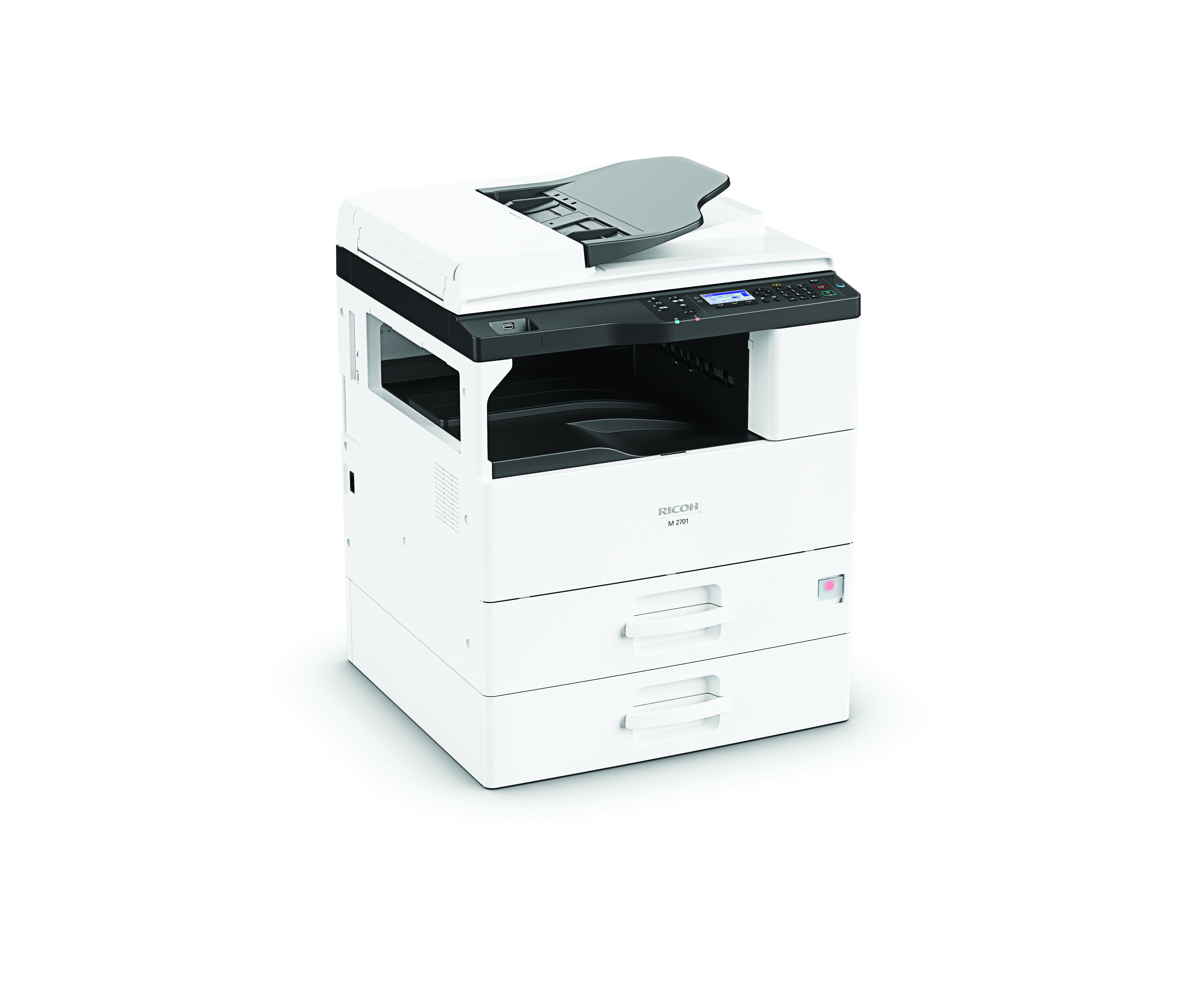 The Ricoh M2701 is a versatile black-and-white multifunction printer designed for small to medium-sized businesses. Here are the key specifications